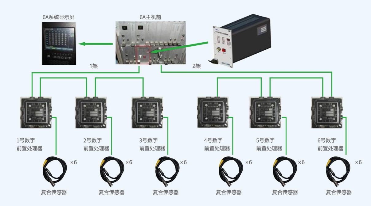 走行部故障监测系统(型号YZD-2)是为保证车辆运行安全与品质、评估部件健康状态而研制的在线实时监测装置。相比轴温监测系统,该系统采用温度、振动和冲击监测相结合的多参数诊断机制及专家系统,可在故障早期发现部件异常,提高运营安全性、及时检修改善部件运行环境、延长部件使用寿命、减少运营成本。系统主要由车载主机、前置处理器及复合传感器组成,整车结构拓扑如下图示意。